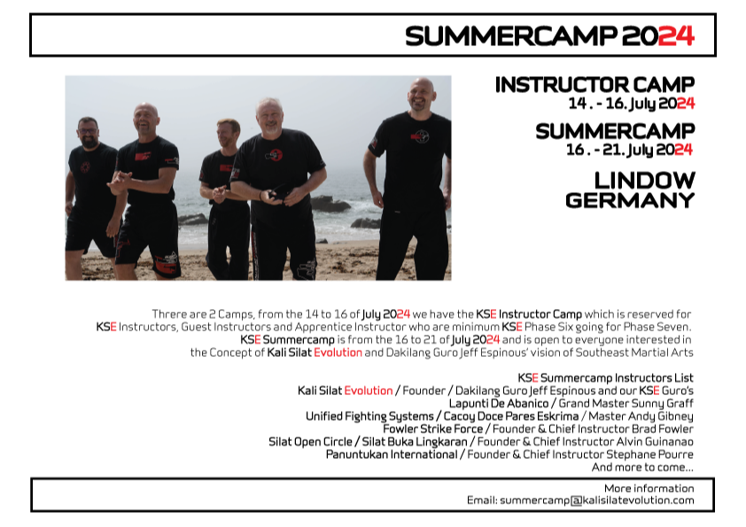 The Summercamp will cover different aspects of the New KSE Program & Concepts and discover different aspect of the Filipino Martial Arts World and the Southeast Martial Arts
